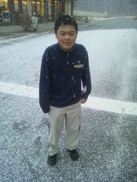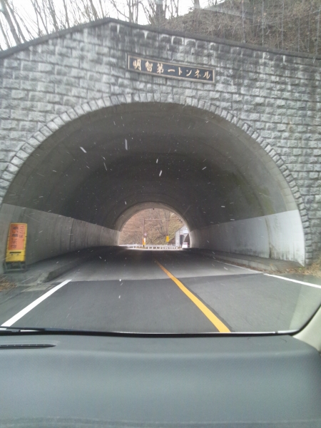 明智平を過ぎると雪が降り始め、