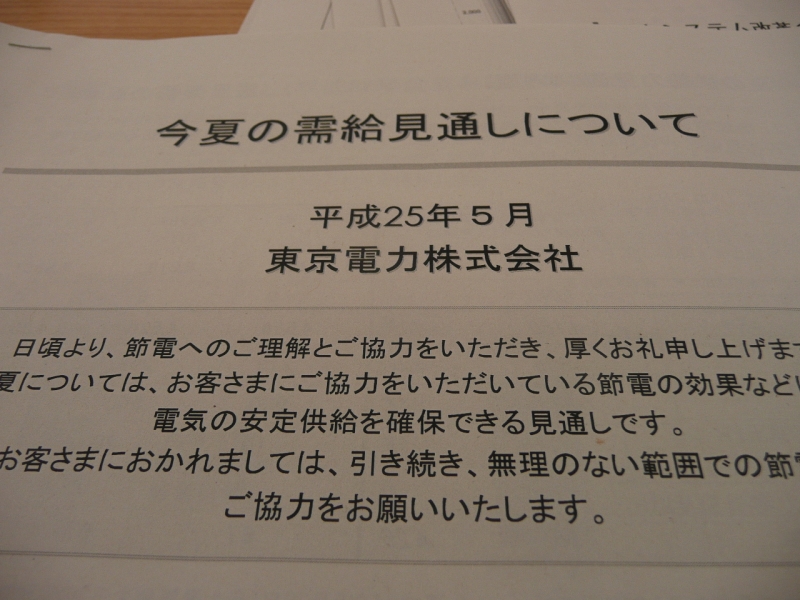 2013-05-23 Home › すべてを表示 › 日常 › 東京電力 東京電力 今日は東京電力の方が来店されました。電力需給などの現状を定期的に報告しに来てくれるのです。需給はともかく、原発事故が尾を引いて先が見えないようで、現場の方々は気苦労が絶えない、といった感じです。 せっかくの報告なので、配電の状況などをいろいろ教えてもらう事にしています。原発のこと、火力発電のこと、今後の東電のこと…結構勉強になった一時間でした。 共有:FacebookX 関連記事 茨大 順調に 菊の鉢植え オフトレ終了 東京スカイツリー ダイキン工業 休日