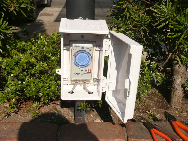 特殊なタイプなので、本体の交換はお金がかかるります。そこでに改造する事を提案しました。人感センサーが壊れてしまっただけなので、時間でオンオフするタイマーを別設しましょう、という事になりました。