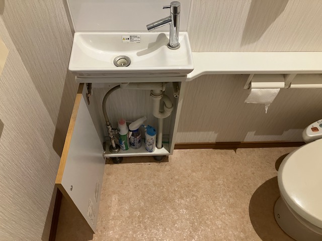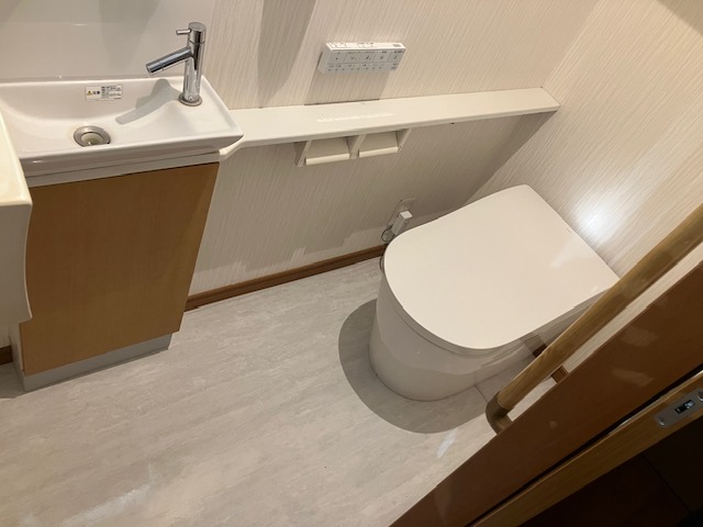 トイレ内には手洗付きのカウンターがあるので下部だけ取外して違和感のない仕上げにしました。便器はTOTOのピュアレストQR、ウオシュレットはアプリコットF3Aにしました。左右にスペースが生まれ掃除が大変やりやすくなり、F様にも大変ご満足いただきました。